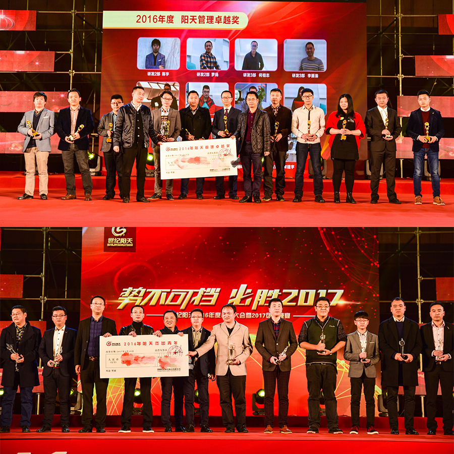 世紀(jì)陽天今天的成就,除了有董事長肖開強先生的戰(zhàn)略領(lǐng)航外,也離不開陽天全體核心精英領(lǐng)導(dǎo)團(tuán)隊的共同努力。每一位陽天的汗水和智慧,共同鑄就了世紀(jì)陽天今日的輝煌。年會上對2016年度先進(jìn)員工、先進(jìn)管理者進(jìn)行了表彰,頒發(fā)了最佳貢獻(xiàn)團(tuán)隊獎、陽天杰出團(tuán)隊獎、最佳貢獻(xiàn)個人獎、陽天管理卓越獎、服務(wù)之星、支撐團(tuán)隊獎、陽天杰出青年等榮譽獎項。